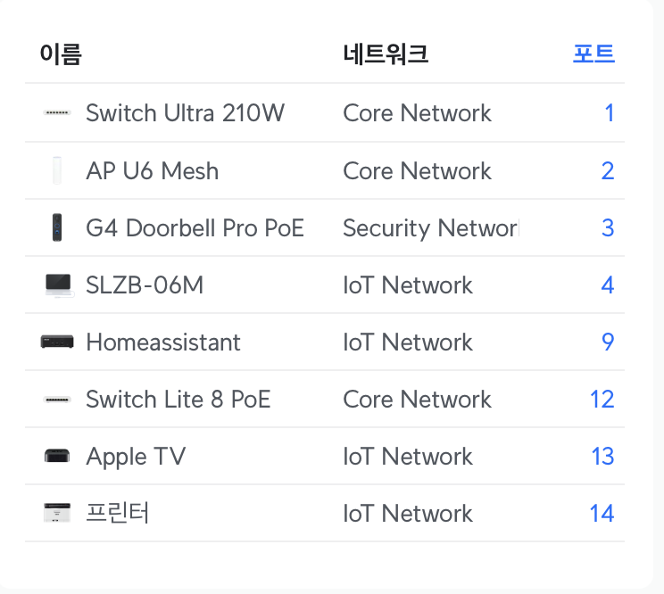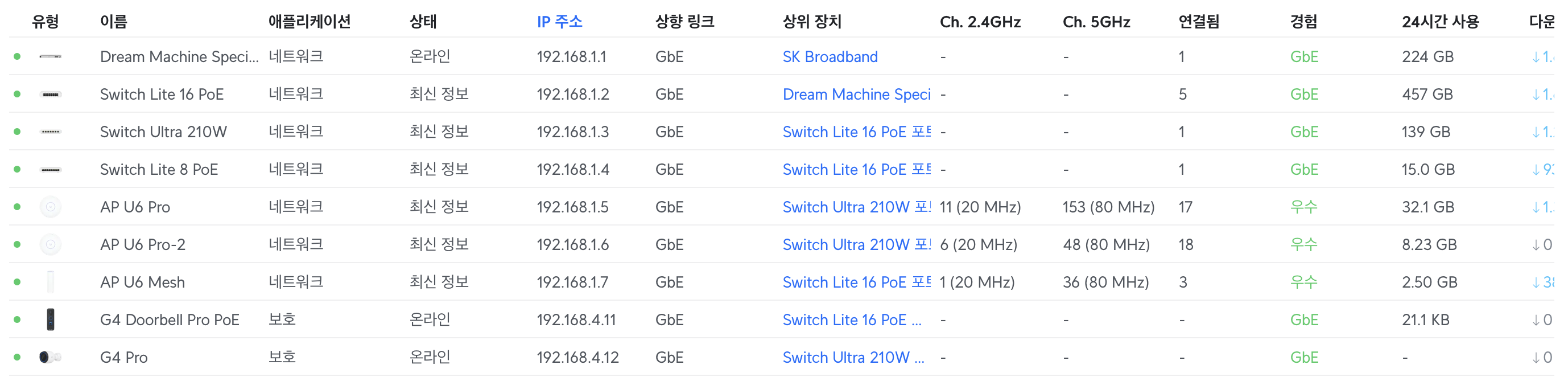작업이 완료된 후 유니파이 장비는 총 9대로 늘어났다. 기존에 현관문 근처에 있던 U6 Mesh는 자리를 내주었고, 대신 USW-Ultra-210W, U6 Pro 1대, G4 Doorbell Pro POE, G4 Pro가 새롭게 추가되었다.