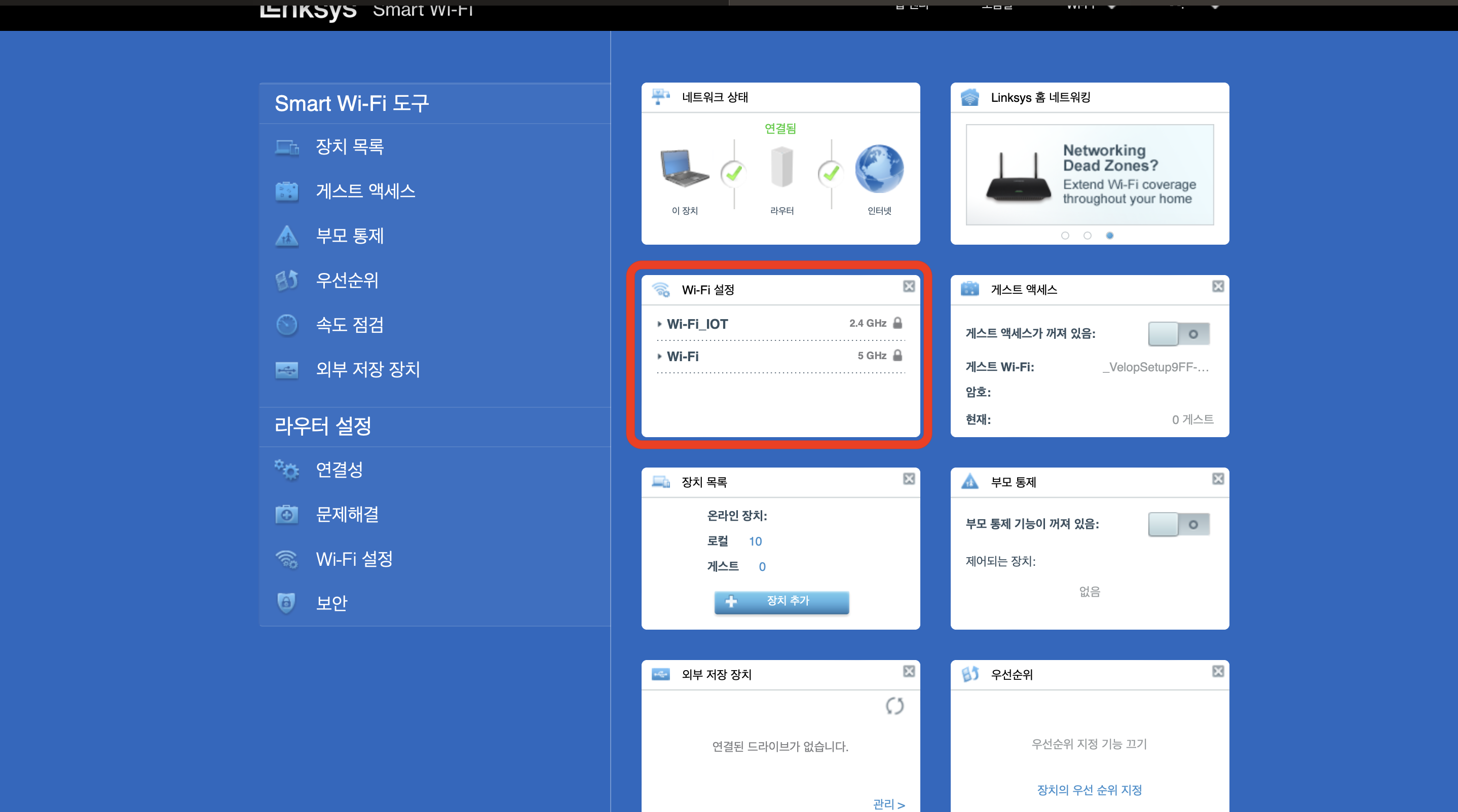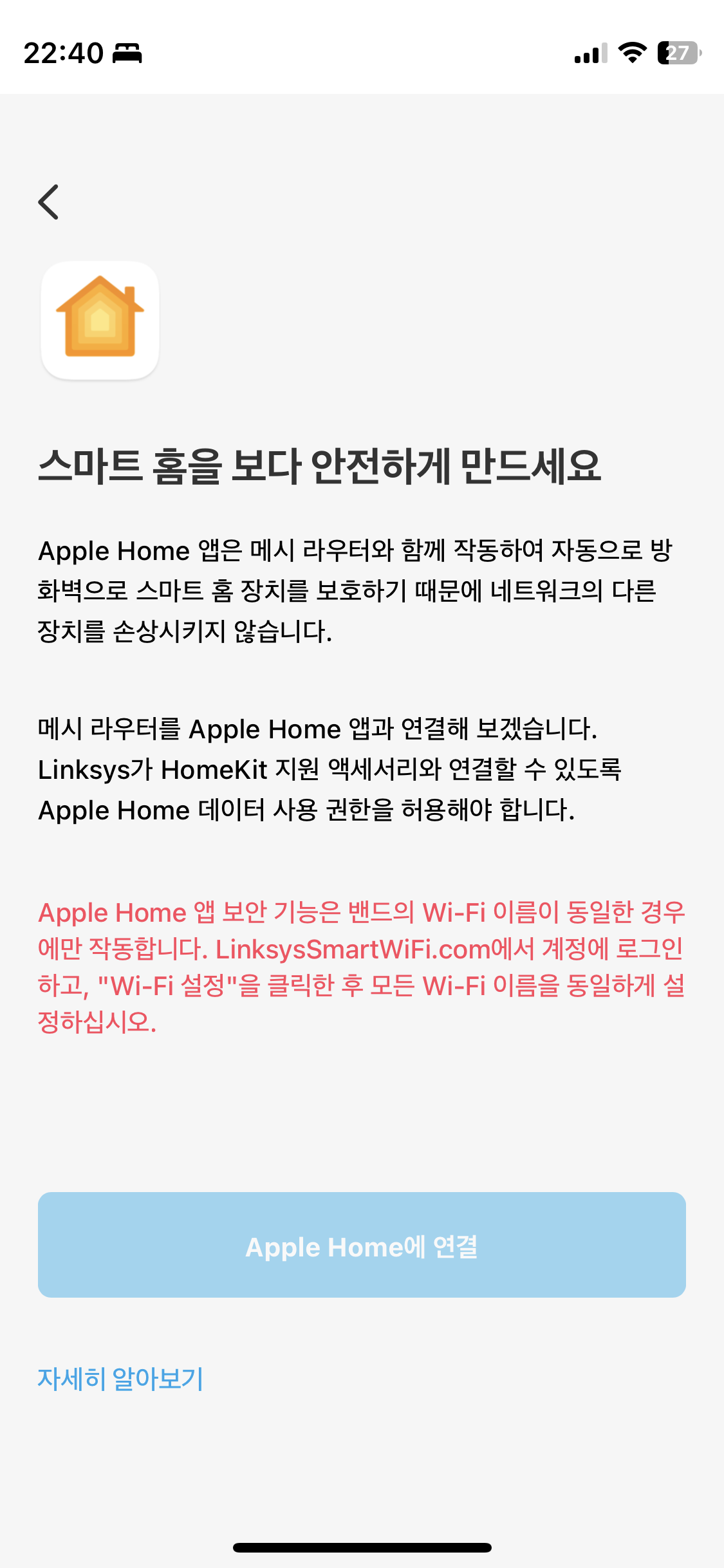 그런데 단점을 발견했다. 메쉬 라우터를 홈킷과 연동하려고 구입한 Velop MX4200이었는데, 2.4 GHz/5 GHz의 SSID를 분리하면서 이 기능을 사용할 수 없게 되었다. 해결 방법이 있는지 좀 더 고민을 해봐야겠다.