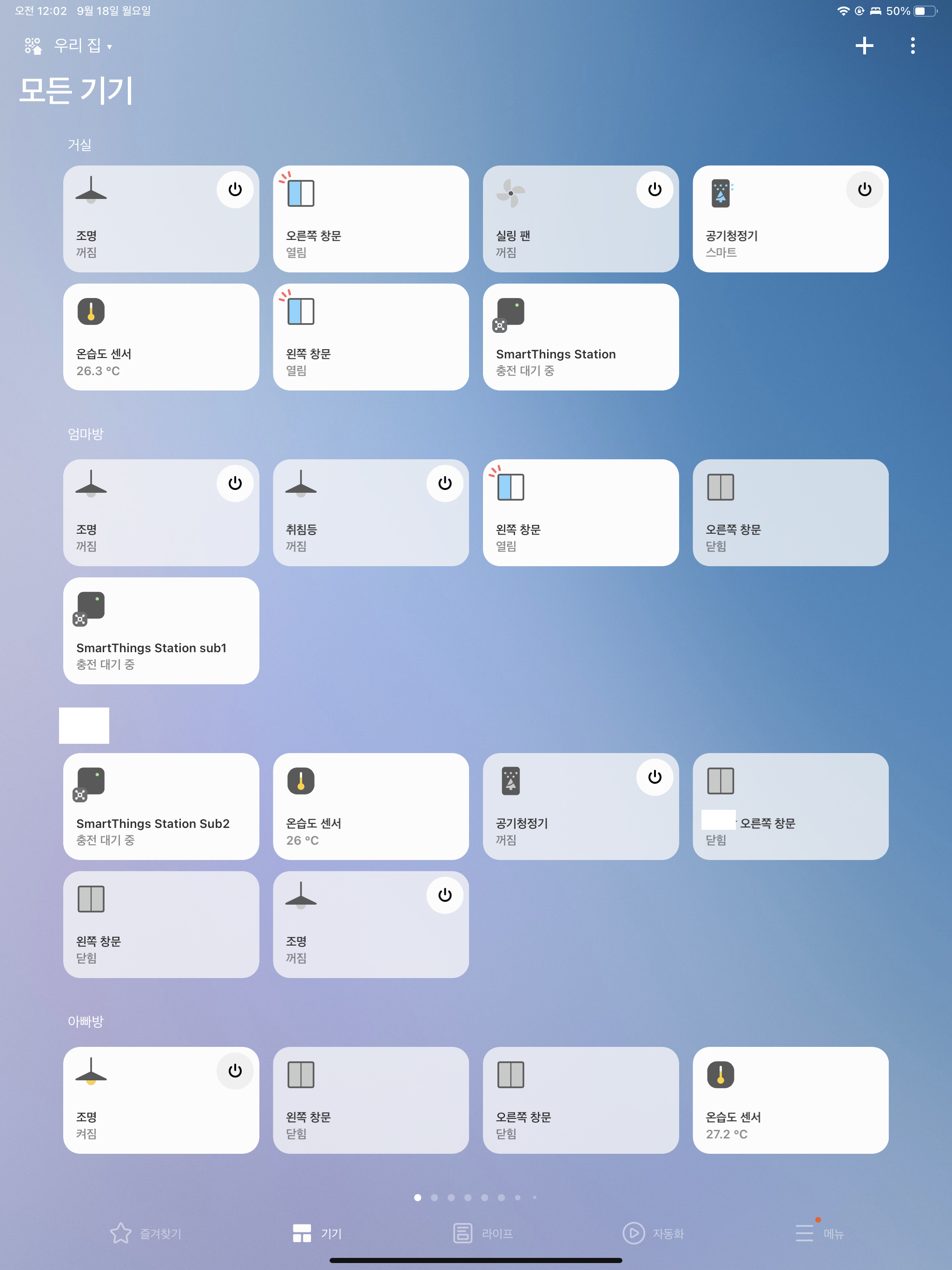 에어컨과 전동 커튼을 제외한 필요한 모든 디바이스를 IoT화한 상태다. 현재 적용된 자동화는 다음과 같다: