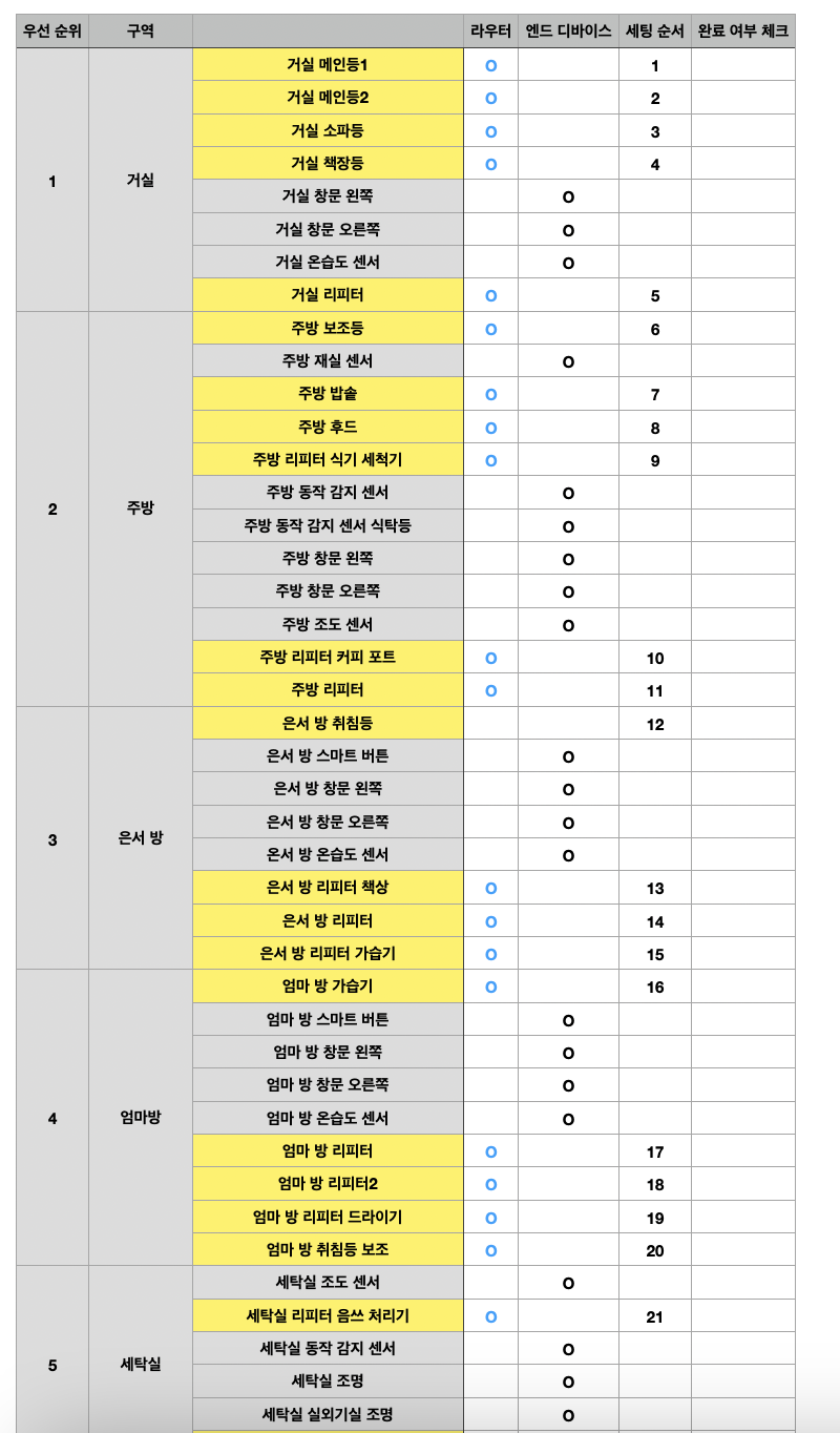 이렇게 철저하게 리스트를 작성하며 페어링을 진행한 이유는, 스마트 홈 카페에서 여러 후기를 본 결과, 페어링 과정 중 어느 순간부터 기기가 제대로 연결되지 않는다는 문제가 발생하는 경우가 많았기 때문이다. 이러한 현상은 신호 음영지역에 위치한 기기들에서 발생할 가능성이 높다고 예상했다. 이런 경우, 근처에 리피터 역할을 하는 라우터가 있다면 문제를 해소할 수 있다는 조언들을 많이 접했기 때문에, 라우터를 우선 페어링하는 방법을 선택했다.