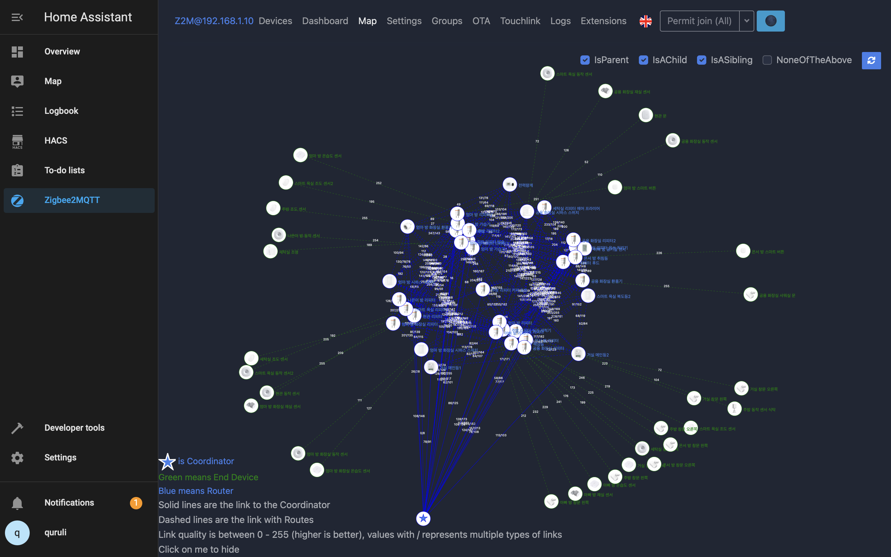 2. 보유 중인 기기들 중에서 지그비 신호 리피터 기능을 가진 디바이스들(지그비 라우터 역할)을 먼저 HA와 페어링했다. 이후 리피터 기능이 없는 엔드 디바이스들은 후순위로 페어링을 진행했다. 이를 위해, 보유 중인 디바이스 목록을 구역별로 정리하고, 각 디바이스가 라우터인지 엔드 디바이스인지 구분해 두었다.