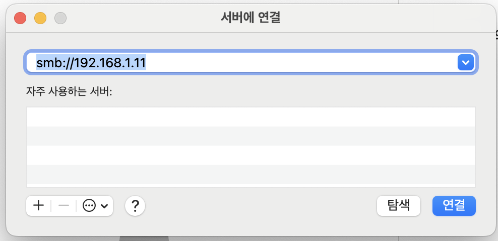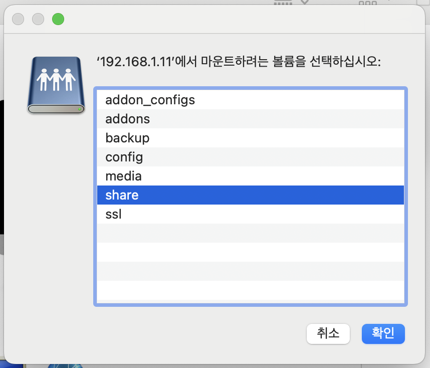 그런 다음 Add-on을 시작(Start) 버튼을 눌러 실행시킨 후, 윈도우나 맥 OS 화면으로 나가서 윈도우 탐색기나 맥 OS Finder를 실행시켜준다. 맥 OS의 경우, Finder를 실행한 후 command + K 단축키를 누르면 팝업이 뜨는데, 여기에서 접속할 smb://HA기기의 내부 네트워크 IP 주소를 입력하고 연결을 눌러준다. 계정 정보 팝업이 뜨면 HA 기기의 username과 password를 입력해준다. 그러고 나서 마운트할 볼륨을 선택하라는 창이 뜨는데, 이때 share 폴더를 선택하면 된다.