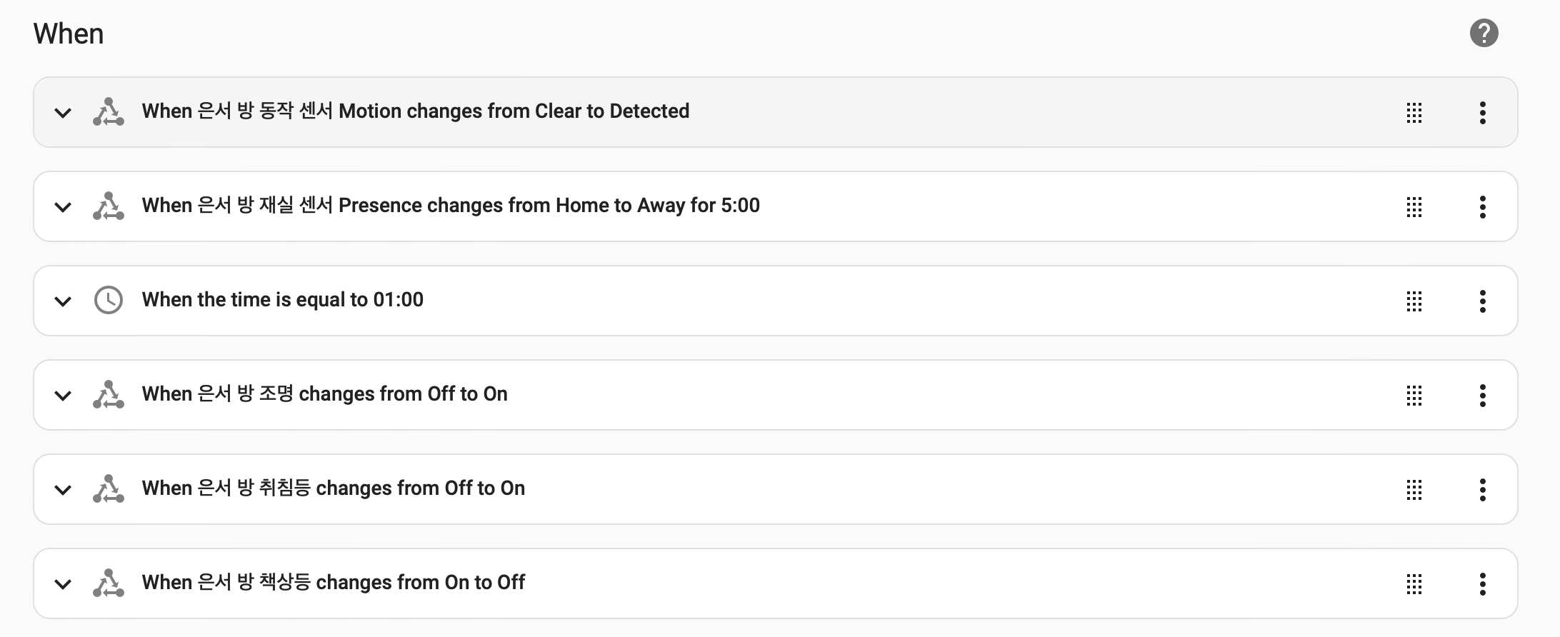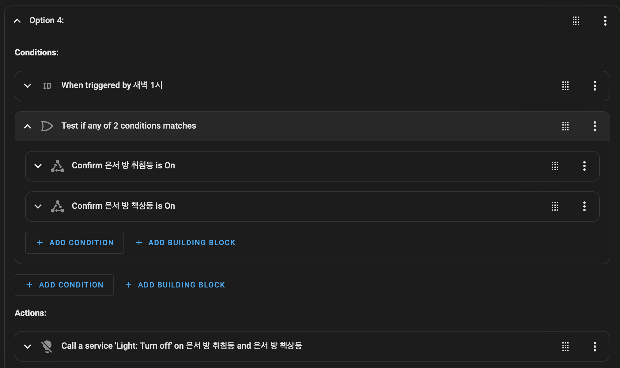 4번 동작) 내 경우 특수한 목적으로 넣은 것으로 일반적으론 필요 없는 자동화이다. 자녀가 불을 안 끄고 자는 습관 때문에 새벽 1시가 되면 방안의 모든 불을 끄는 자동화이다.