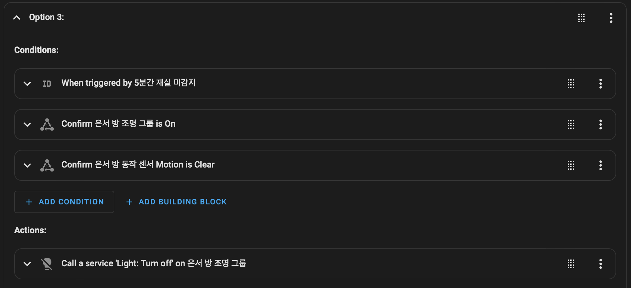 방 안에 사람이 없는 상황을 판단하기 위해, 재실 센서뿐만 아니라 “동작 감지가 안될 때”라는 조건을 추가로 넣은 이유는, 재실 센서의 신뢰도가 완벽히 높다면 불필요한 조건일 수 있다. 실제로 FP1 재실 센서를 1년 정도 사용해보니 신뢰도가 상당히 높다고 느꼈다. 하지만 만에 하나라도 방 안에 사람이 있는데 갑자기 불이 꺼져서 당황스러운 상황이 발생할 수 있기 때문에, 이러한 상황을 최대한 방지하고자 추가로 이 조건을 넣었다.