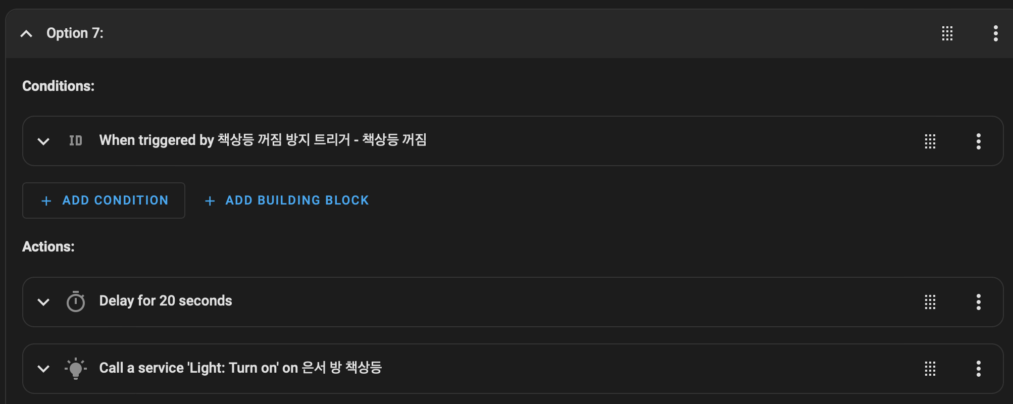 20초 딜레이를 넣은 이유는, 원격으로 책상등 조명을 끄기 위해 책상등과 연결된 스마트 플러그의 전원을 꺼졌을 때, 이 자동화가 즉시 작동하여 스마트 플러그 전원이 너무 빠르게 다시 켜지는 바람에 실제로는 책상등 조명이 꺼지지 않고 계속 켜짐 상태를 유지하게 되는 상황을 방지하기 위해서이다.
