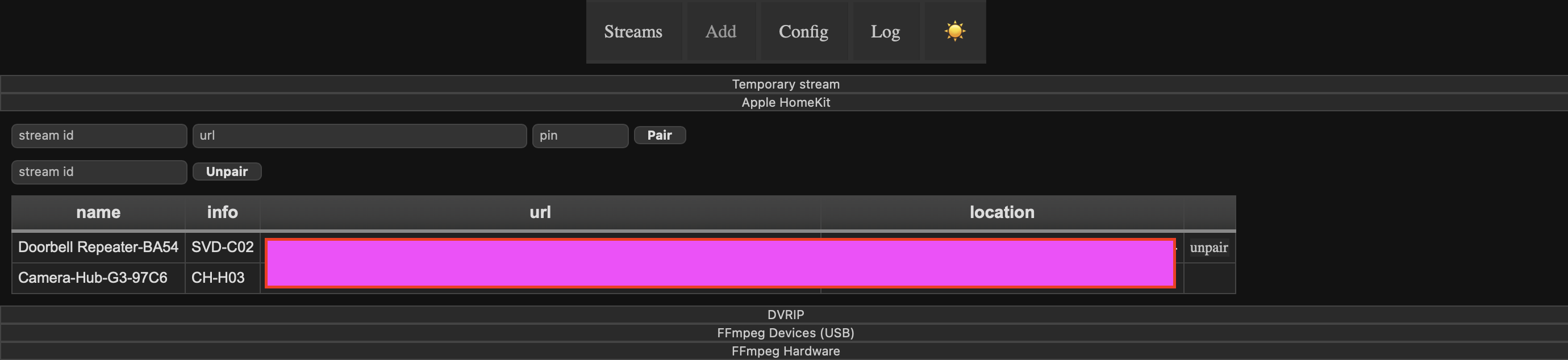 • “Apple HomeKit” 버튼을 누르면 HA가 애플 보안 카메라를 검색한다. 중요한 부분은 location 컬럼 우측에 “pair” 버튼이 보여야 한다. 이 버튼이 보이지 않으면 다른 플랫폼과 연결되어 있거나 버그일 가능성이 있으므로, 기기를 초기화한 후 다시 아카라 플랫폼에 연결하고 과정을 반복한다.