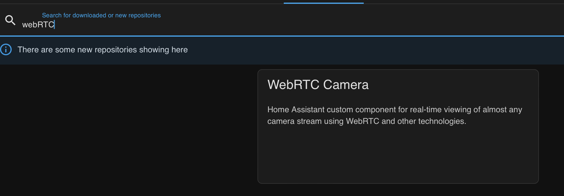 HACS에서 "webRTC Camera"를 검색해서 설치한 후 HA를 재부팅한다.