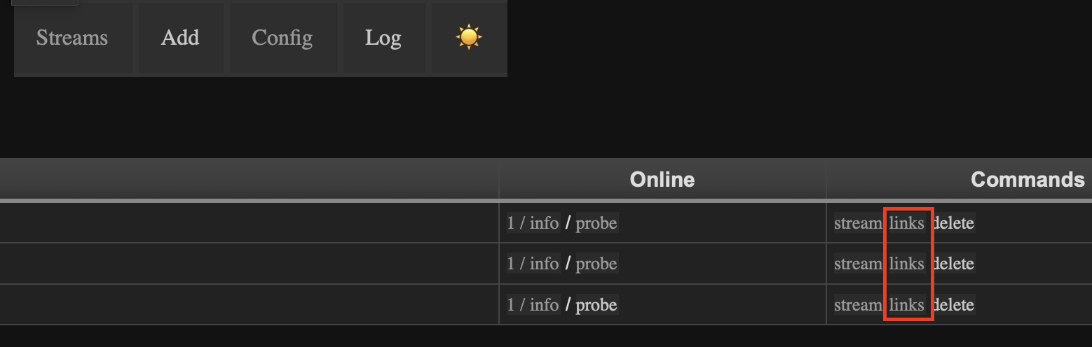 • Go2RTC에서 상단의 “Streams”를 눌러 등록된 카메라 정보를 확인하고, links 부분을 클릭해 카메라 영상 소스의 URL을 얻는다.