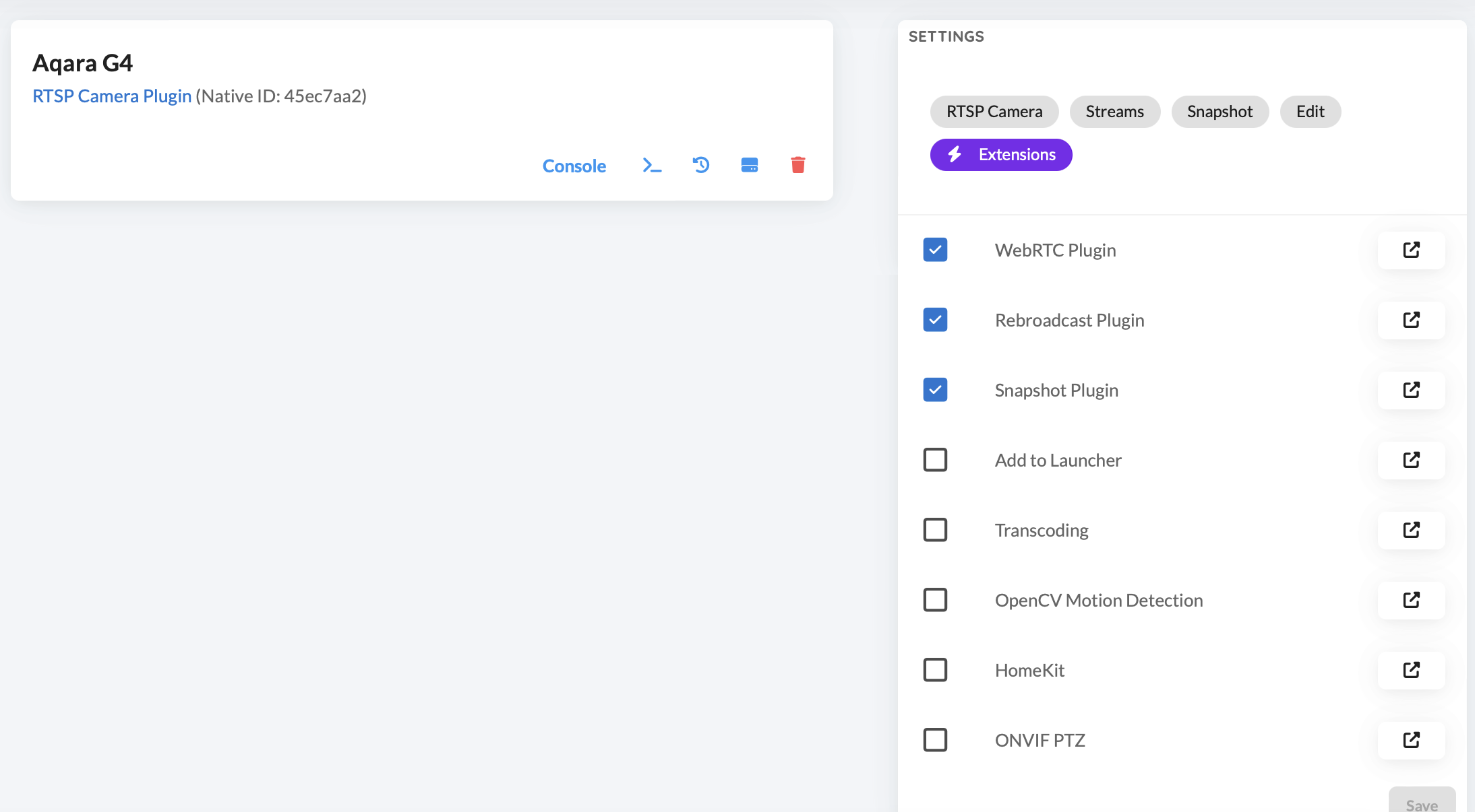 우측 상단에 Extensions를 누르면 아까 생성한 Aqara G4라는 디바이스에 적용할 plugin을 추가해 줄 수 있다.