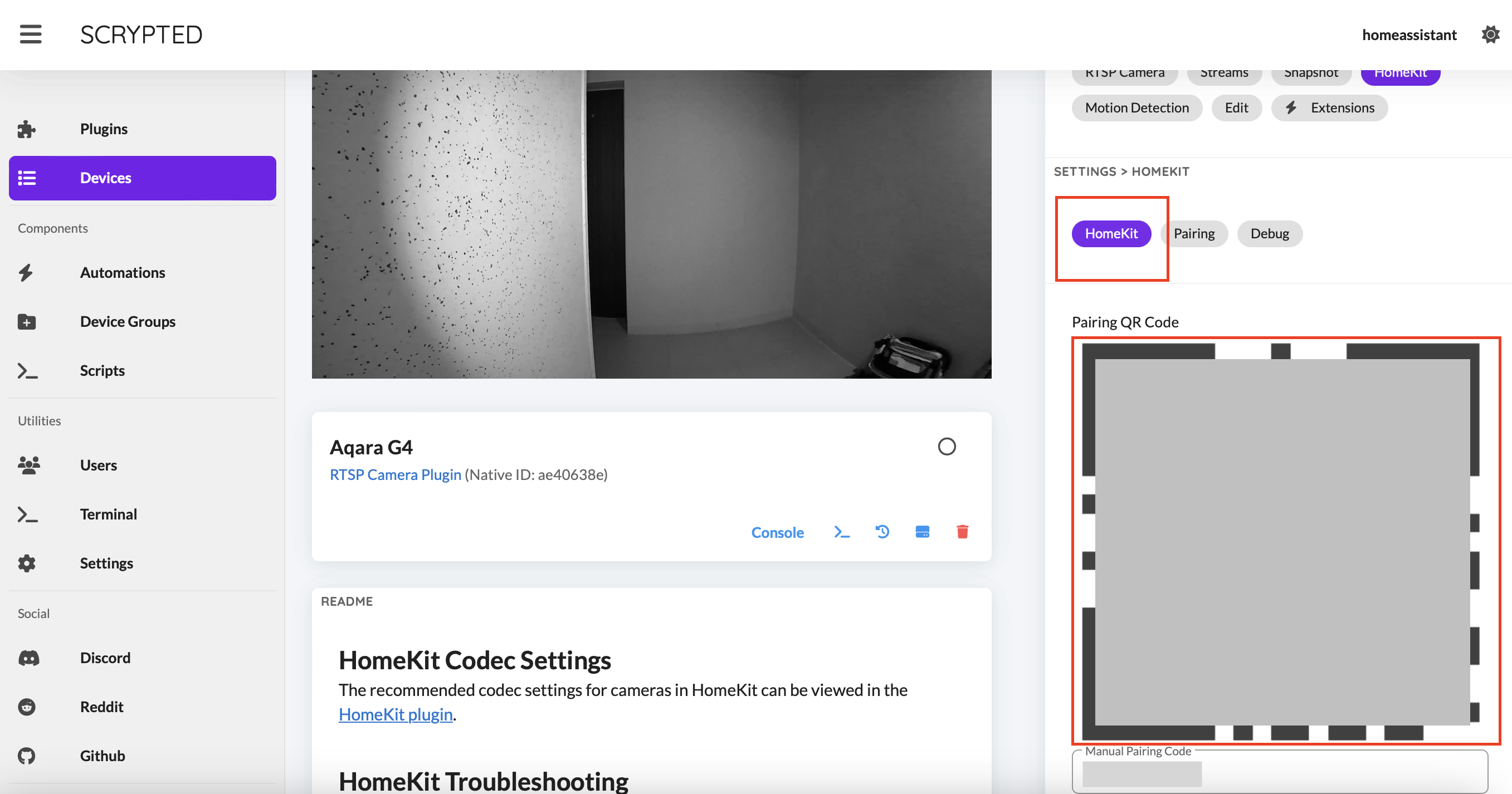 우측에서 Homekit을 누르면 홈킷 페어링용 QR코드와 페어링 숫자 코드가 나온다. 이것을 이용해서 홈킷에 등록하면 성공이다.
