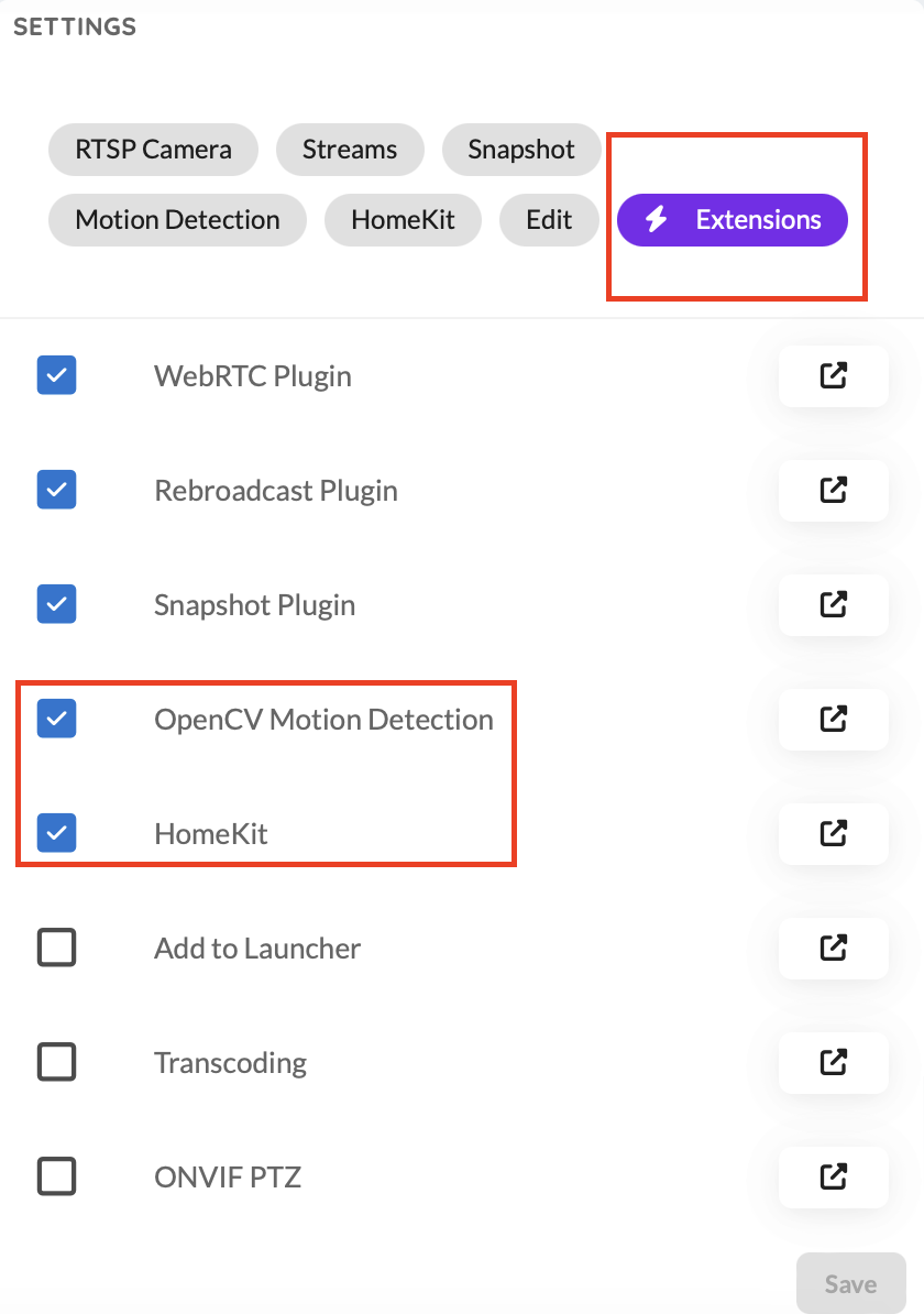 Homekit에 등록하기 위해 Homekit plugin을 선택해 주고, 카메라가 동작인식 시 알림을 주기 위해 OpenCV motion detection까지 체크해 준다.