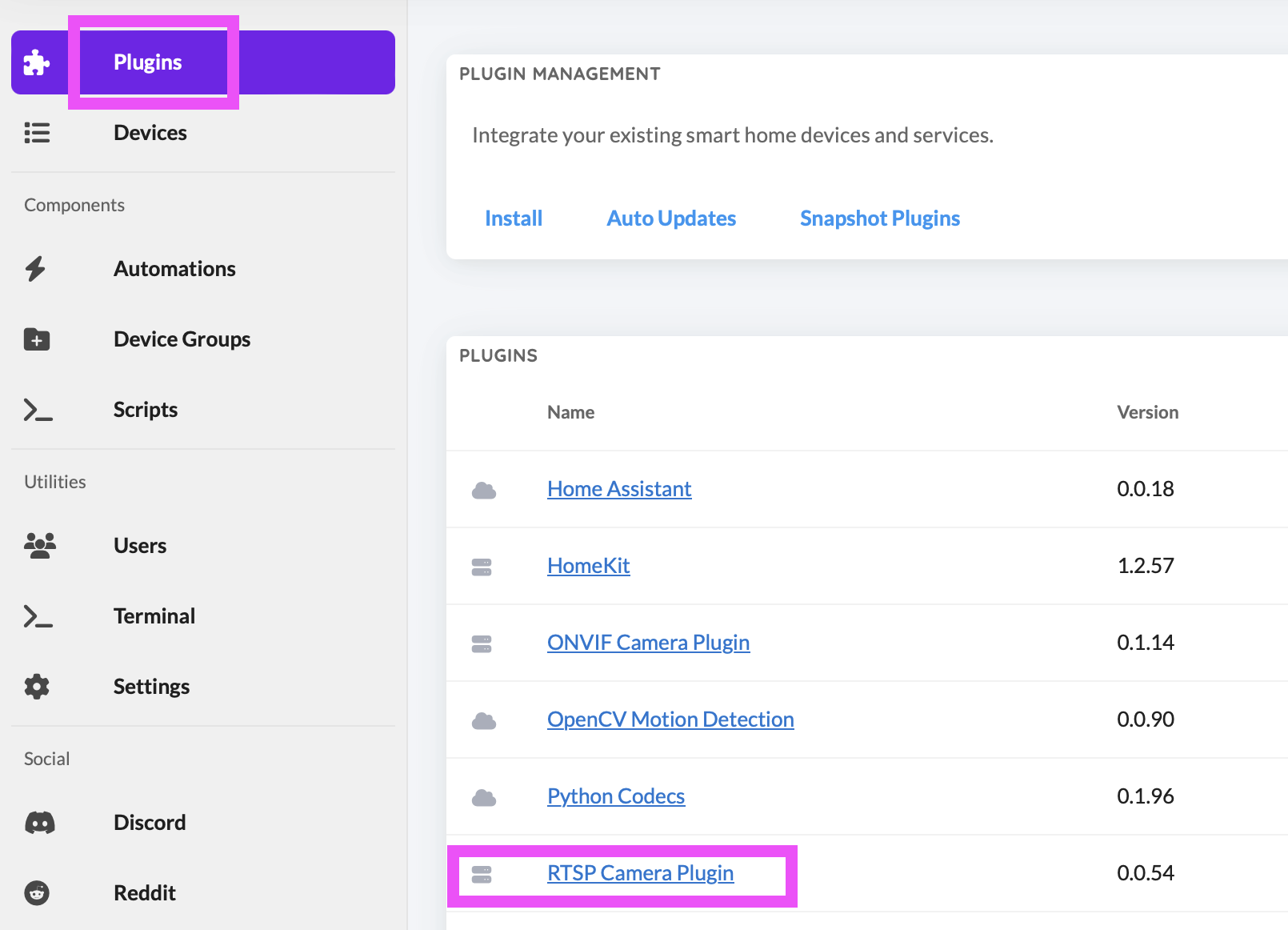 좌측 사이드바에서 Plugins를 누른 후, 우측에서 RTSP Camera Plugin을 찾아서 누른다.