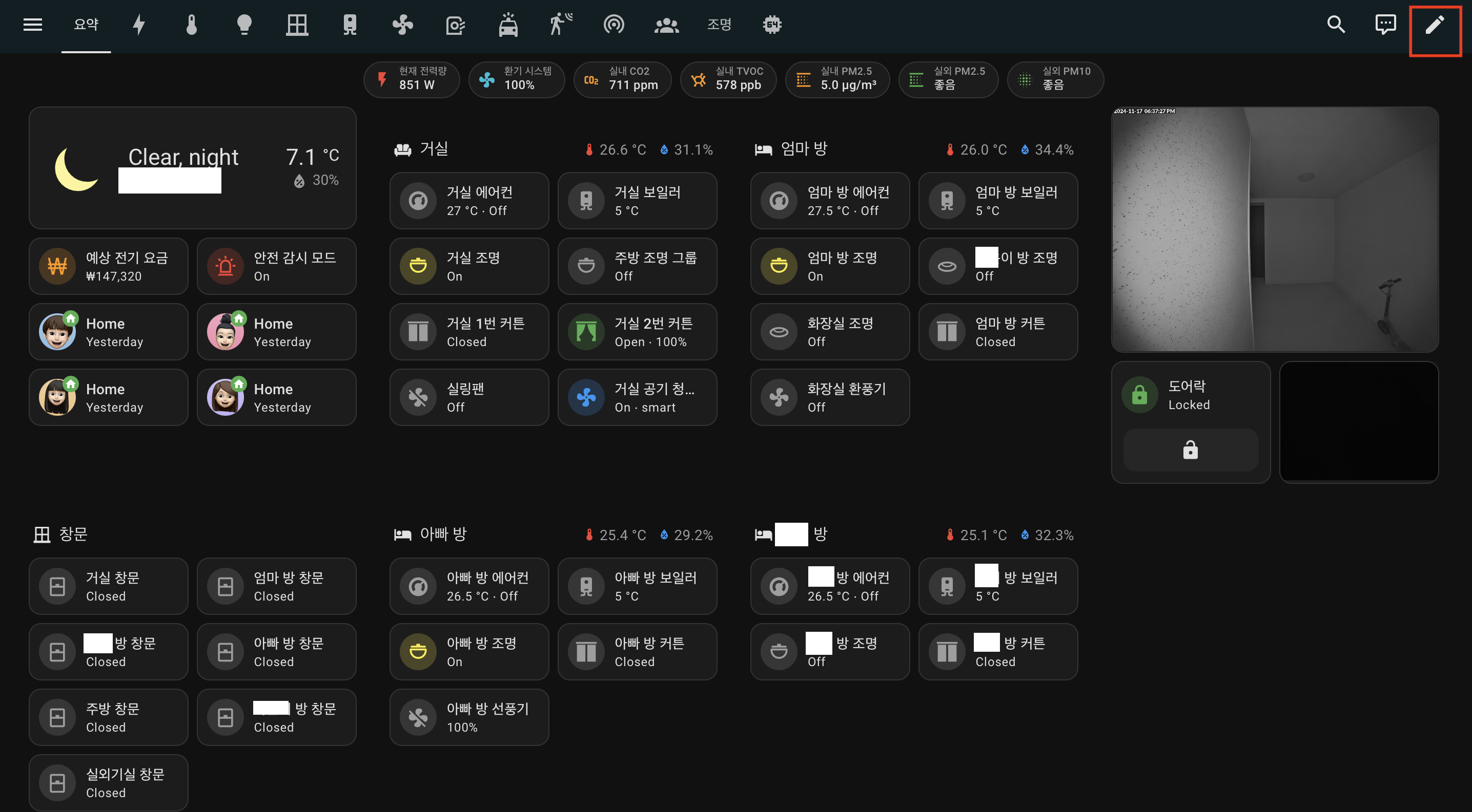 HA 대시보드에서 우측 상단의 연필 아이콘을 눌러 대시보드 편집으로 들어간다.