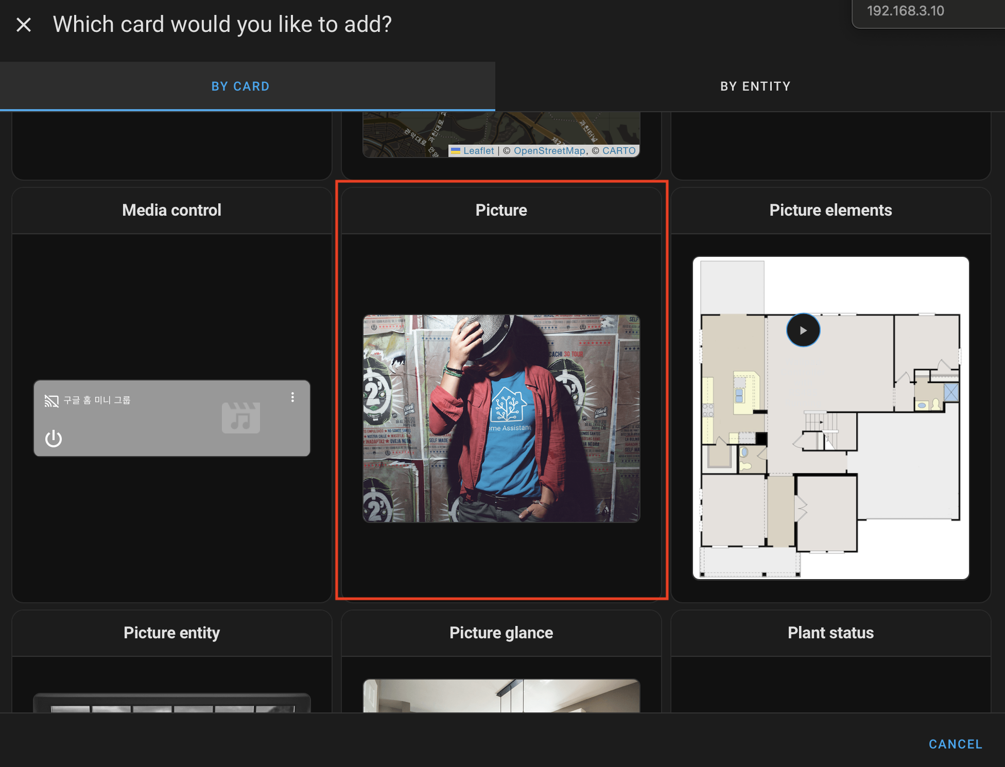 대시보드에 추가할 카드는 아래처럼 Picture를 선택한다.