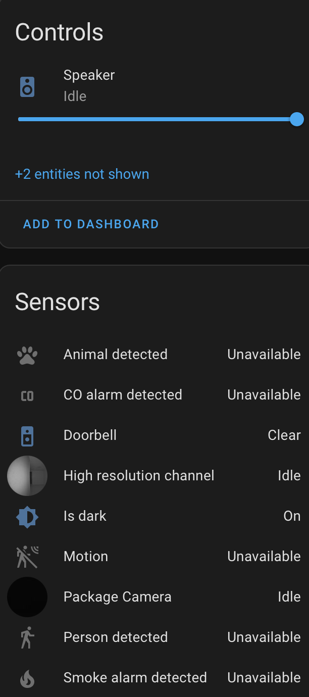 아래는 HA와 연동된 후 올라온 유니파이 카메라와 각 구성 요소들이다. G4 도어벨의 경우는 정면 카메라와 하단 카메라 이렇게 2개 있다 보니 HA에도 카메라 구성 요소가 2개 생성되었다.(high resolution channel, Package Camera)