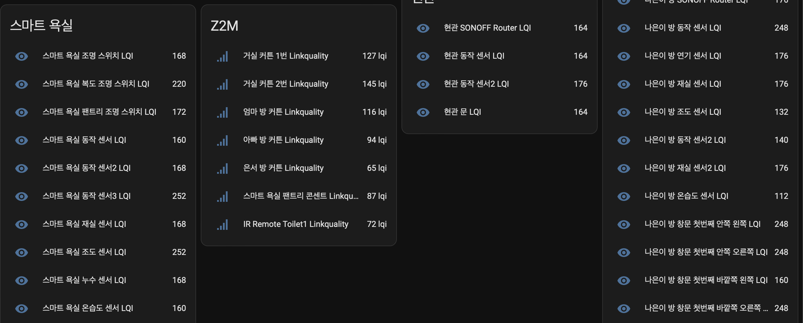 Z2M에서 ZHA로 이사한 과정이제까지는 Zigbee 코디네이터로 Sonoff Dongle-P 버전을 사용해왔다. Z2M(Zigbee2MQTT)을 사용하는 동안 Ti사의 칩이 들어간 이 모델이 가장 안정적으로 작동한다는 평을 듣고 선택했고, 실제로 매우 만족스럽게 사용했다. 다만, 후속으로 나온 Dongle-E 버전과 비교했을 때 LQI(Link Quality Indicator)가 상대적으로 낮게 측정되는 점이 아쉬웠다. 이번에 Dongle-E로 교체했는데, P 버전에 비해 Z2M에서의 안정성은 다소 떨어지지만 LQI는 거의 1.5~2배 높게 나왔다. P 버전을 사용할 때는 LQI가 최대 180 정도로 측정되며, 일부 기기에서는 최소 10까지 떨어지기도 했으나, E 버전은 최대 255, 최소 100 정도..